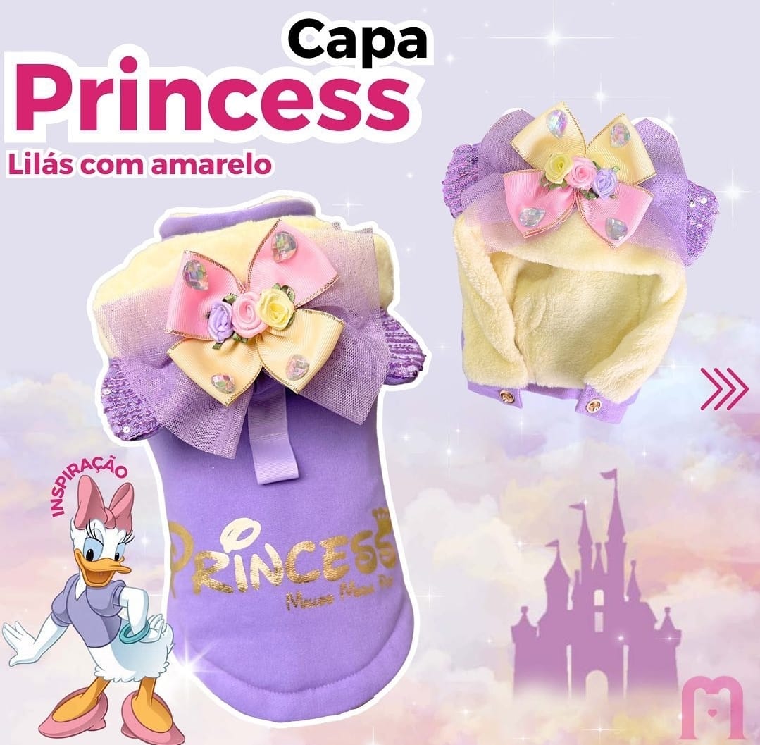Tecido moletom por fora, pelúcia por dentro. Gorro destacável com botão de pressão possibilitando o uso com ou sem gorro. Engate para guia. Fechamento em velcro. Estampa dourada em Silk. Orelhas em paetê, laço em tule e gorgurão.