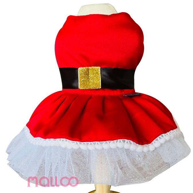 Dois vestidos em um, Natal e Reveillon. Tecido acetinado para não embolar os pelos, “Feliz Ano Novo!” em strass e barra com mini pompons.