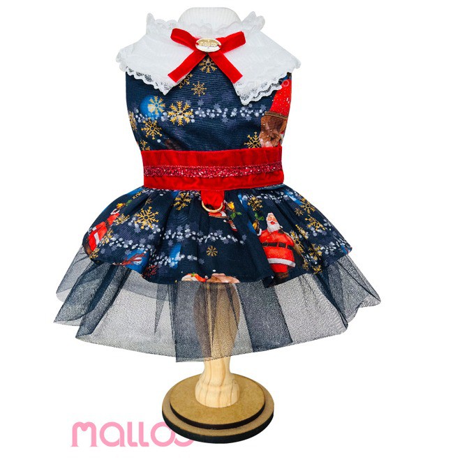 Estampa lindíssima com motivos natalinos, detalhes em fita de veluda e fitas de micro paetês vermelho, e gola de boneca com renda francesa.